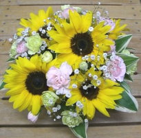 AT-037 夏ひまわり他のアレンジメント 高さ約17cmx幅約22cm 価格:3,850円(消費税込) |