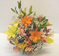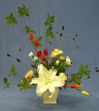 ![]() AT-023 ユリを使ったアレンジメント 高さ約35cmx幅約35cm 価格:3,850(消費税込) |
