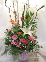 ![]() AT-047 ユリ他のアレンジメント 高さ約50cmx幅約50cm 価格:5,500円(消費税込) |